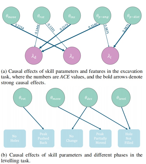任务场景的扩展性不足:当前 Celebi 仅支持挖掘与平整两类单阶段任务,对于多阶段复杂操作(如 “挖掘 - 运输 - 倾倒” 的土壤转移任务),现有参数定义与因果优化策略难以覆盖 —— 多阶段任务中参数的因果效应会随任务阶段动态变化(如挖掘阶段\(\theta_{ins}\)影响大,运输阶段\(\theta_{rot}\)影响大),需更灵活的因果分析机制。