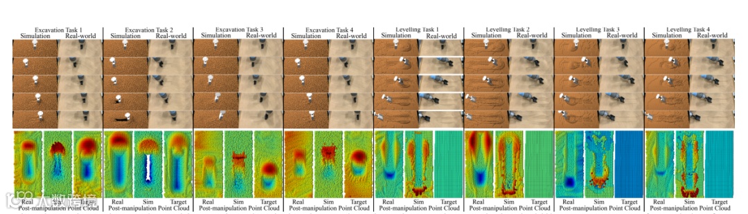 第三,仿真 - 真实迁移鸿沟显著:尽管仿真环境能低成本生成大规模数据,但现有仿真模型难以精准复现颗粒材料的真实力学特性(如摩擦系数、内聚力、压实度),导致基于仿真数据训练的策略迁移到真实世界时性能大幅衰减。例如,仿真中土壤颗粒的粘附效应被简化,会导致真实场景中挖掘的坑洞形状与仿真偏差显著,平整时也易出现表面凹凸不平的问题。