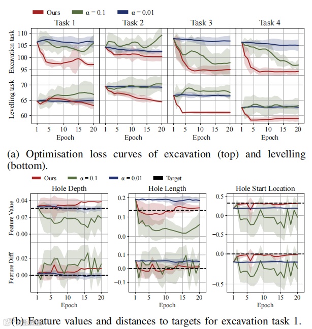 结果表明,移除因果引导后,模型的收敛速度显著变慢(+101.2%),操作精度大幅下降(挖掘误差 + 112.5%,平整误差 + 90.8%),迁移误差增加 169.2%,证明因果引导是提升优化效率与精度的核心;移除结构化特征提取后,因原始高度图的高维性导致因果分析噪声增大,模型性能也出现明显衰退(收敛 epoch +74.4%,挖掘误差 + 71.9%),验证了任务感知特征定义的重要性。