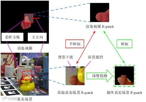针对示教过程涉及的目标物体特征多样且更换频繁的特点,提出一种具旋转不变性且对环境干扰具有鲁棒性的局部特征E-patch。E-patch以前景深度边缘点为中心沿深度梯度方向采样,从而具有良好的旋转不变性。依据深度检测结果剔除E-patch中的前景遮挡和背景干扰区域,从而提升了对环境干扰的鲁棒性。在孪生网络框架下训练基于CNN建立的特征编码器,以实现E-patch相似性度量向特征向量欧氏距离空间的映射。