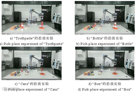 最后,基于UR机器人、Kinect深度传感器和上位机搭建学习拾放任务的实验平台算法。训练得到机器人的运动控制器,之后基于视觉感知算法估计初始场景内操作目标的空间位姿,最后将其代入运动控制器驱动UR机器人完成拾放任务。