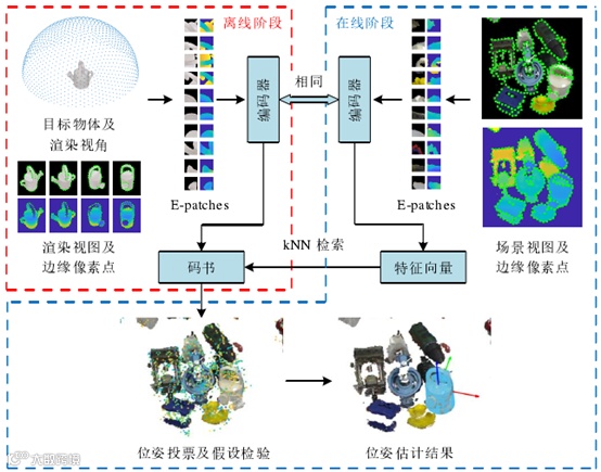 然后结合特征匹配和位姿投票算法的优点,提出一种基于E-patch特征的目标检测与位姿估计算法。在离线阶段中,借助ChArUco标定板重构目标物体的网格模型之后,从均匀分布的采样视角得到RGB-D渲染视图,最后利用提取自各渲染视图的E-patch构建特征码书。在线阶段则通过特征匹配和位姿投票算法框架生成假设位姿。针对物体模型中不可见点对ICP配准结果的干扰,仅基于可视曲面实现假设位姿的检验与细化。