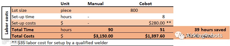 显然,购买设备和培训人员的初始费用是无法避免的。但是,让我们比较手动 MIG 焊接和协作机器人 MIG 焊接对以下工作的成本和时间要求: