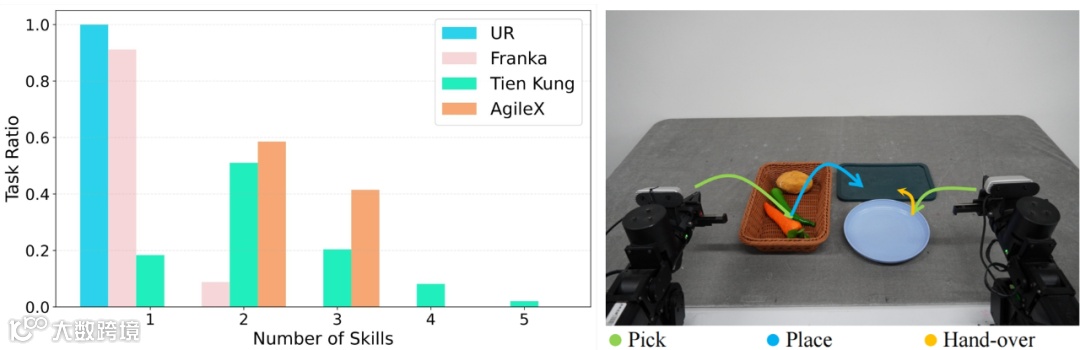 下图生动地呈现了四种机器人平台在执行任务时所运用技能数量的直方图。AgileX平台的任务通常需要两到三种技能的组合,这导致了任务执行时间的延长。相比之下,“天工”平台的任务复杂度各异,部分任务甚至涵盖了高达五种不同的技能。为了更直观地展示这一点,研究团队特别选取了一个涉及三种技能的AgileX任务,并在图中描绘了其双臂协同操作的精确轨迹:两只手臂首先依次完成抓取动作,随后左臂将胡萝卜放置到位,右臂则负责将其移交至黑色盘子中。这一连贯的操作流程对机器人的协调能力提出了极高的要求。