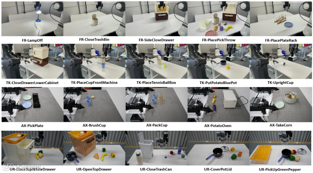 研究团队使用RoboMIND数据集,测试了4种目前主流的机器人学习模型,分别为ACT、BAKU、RDT-1B和OpenVLA。以下是RoboMIND数据集包含的部分任务样例:
