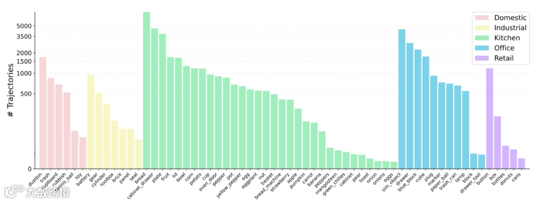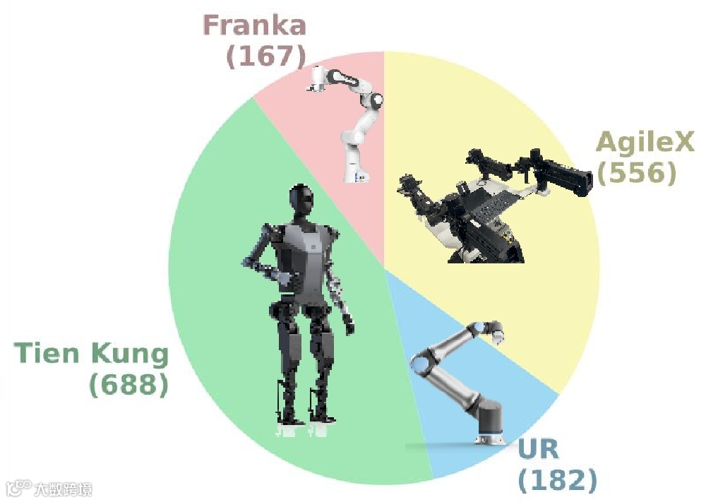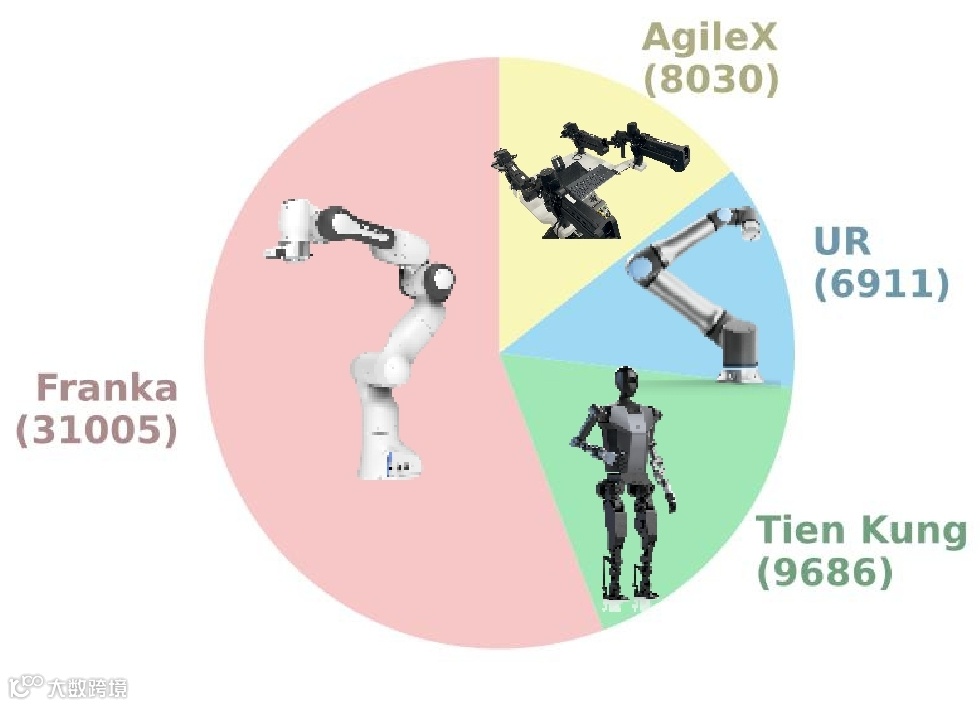 2)多样化轨迹长度:研究团队深入分析了各类机器人模型在执行任务时的平均耗时,即每个轨迹所包含的时间步数。结果显示,Franka和UR机器人的轨迹相对较短(通常不超过200个时间步),这使得它们成为训练基础技能的理想选择。而“天工”和AgileX机器人的任务轨迹则明显更长(超过500个时间步),这为它们在长时间跨度任务训练和技能组合方面提供了优势。这一发现对于优化机器人训练策略具有重要意义。