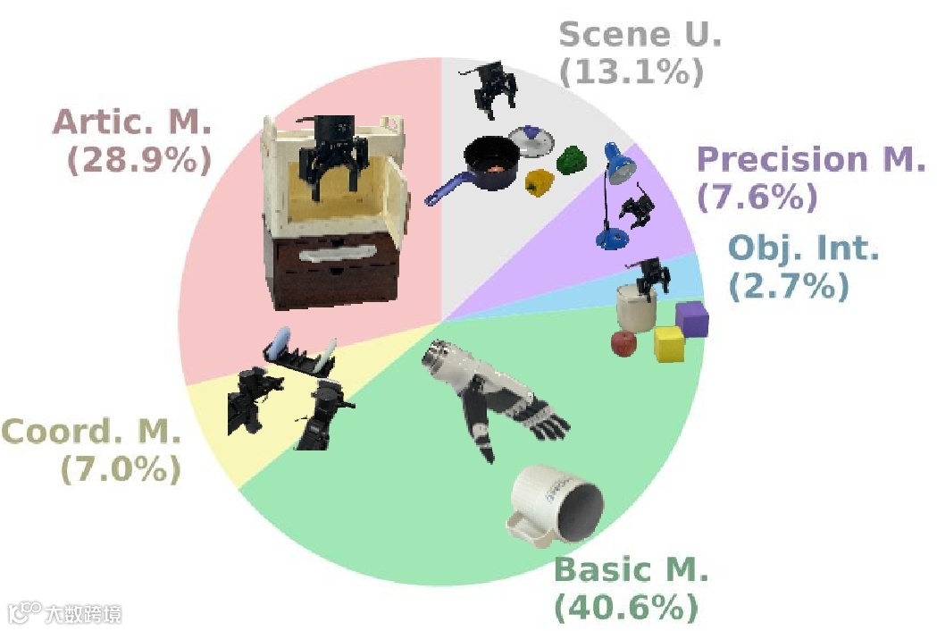 3)任务多样性强:研究团队在对自然语言描述进行深入分析后,采用了一种系统化的方法来对数据集中的任务进行分类。他们综合考虑了物品的大小、使用场景以及操作者所需的技能水平等多个维度,从而确保分类的科学性和实用性。这种分类不仅有助于理解任务的复杂性,还能为后续的研究和应用提供指导。具体来说,他们将任务分为五大类别:基础技能、精准操作、场景理解、柜体操作和协作任务。基础技能类任务主要涉及一些基本的操作技巧,如抓取和放置物品;精准操作则要求更高的精确度和控制能力;场景理解要求操作者能够识别并适应不同的环境条件;柜体操作则专注于与存储设备的交互;而协作任务则需要多个操作者或系统之间的协调与合作。通过这样的分类,研究团队能够更清晰地把握不同任务的特点和难点,为进一步的研究提供了坚实的基础。: