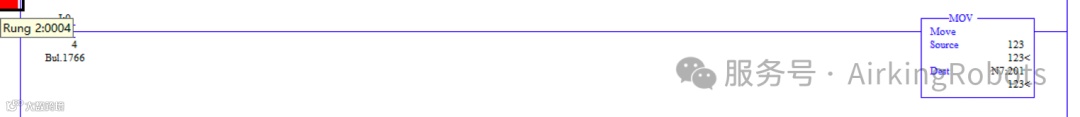 上述配置完成后,机器人可以做出询问得到PLC的数据。机器人打开Modbus界面、可观察到PLC利用MOV传送指令将“123”发送到N7:201地址中,可在机器人界面通过读取寄存器输入地址为201,可得到“123”这个值,见参阅下图: