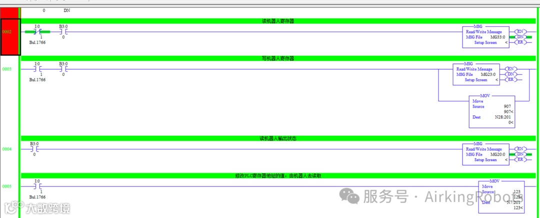 下图为本次测试的PLC程序,列举了读写机器人寄存器、读取机器人输出状态信息以及读取PLC寄存器数据: