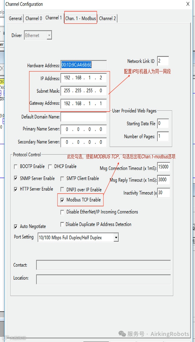 MicroLogix 1400中以太网通道1的默认通信协议是以太网/ IP。要与MicroLogix 1400系列B控制器中的Modbus TCP协议通信,必须为Modbus TCP协议配置通道。