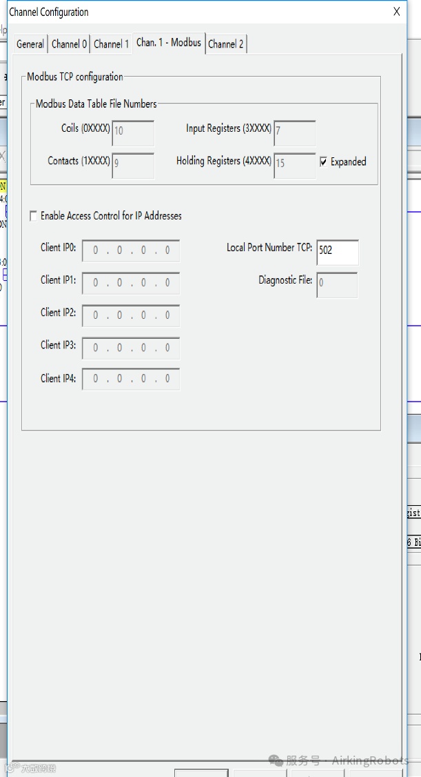 新建一个对应的CPU的PLC程序,双击“通道配置”选择“channel 1”配置IP地址,并勾选“Modbus TCP Enable”勾选后会出现一个新选项“Chan.1-Modbus”,此页面配置完成后进入“Chan.1-Modbus”中,配置寄存器地址。请参考以下图片: