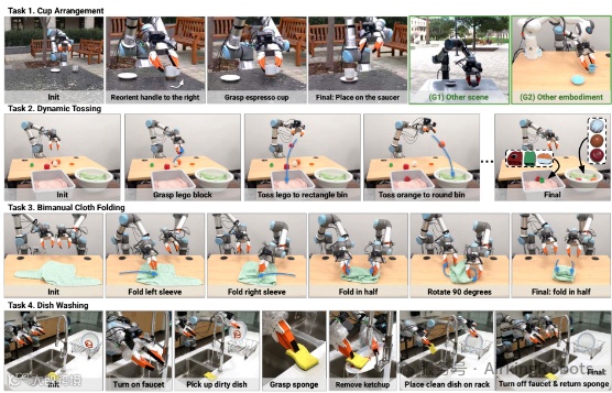 除刷碗之外,还展示了叠衣服、摆放餐具和抛物投篮,都是学习了人类演示后,机器人全自主行动无遥控,1倍速播放。