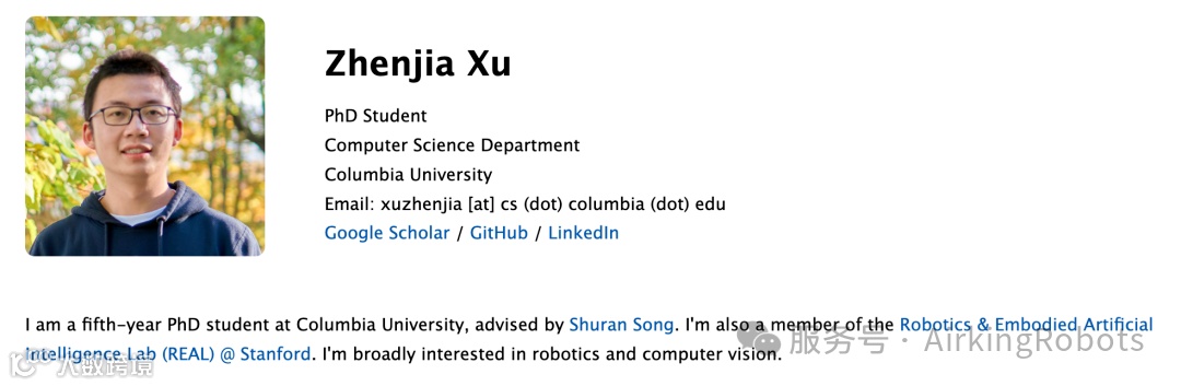 共同一作上交大校友Zhenjia Xu,哥伦比亚大学博士生及斯坦福大学机器人与具身智能实验室 (REAL)成员。