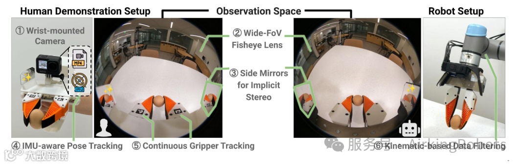 上面搭载的GoPro运动相机,是唯一的传感器和记录设备,这种设计可以最小化人机观测空间上的差异,保证策略部署时的鲁棒性,同时也简化了硬件搭建。