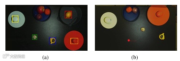 III-A:(a)-(b) 物品根据推断的类别(水果与蔬菜)被分入两个盒子中,水果被放在较大的容器里,蔬菜被放在较小的容器里。