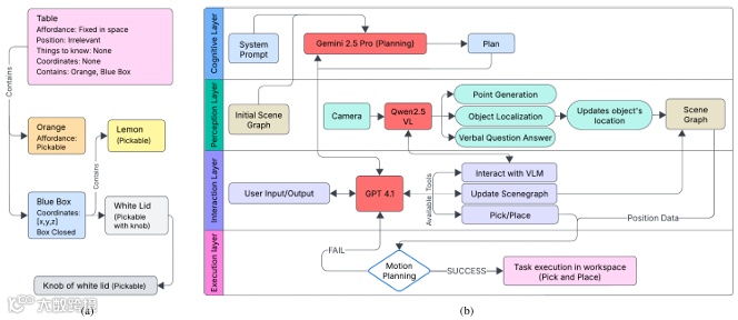 (a)场景图结构。(b)系统架构。各层以自下而上的层次结构组织。执行层:依靠传统的运动规划器和控制器,确保对物体进行稳健且精确的操作。交互层:利用强大的非推理模型来解读用户指令并协调任务执行。感知层:整合了一个视觉语言模型(VLM),该模型接收来自 3D 相机的 RGB-D 输入,以提供空间理解、物体定位和语义场景描述。认知层:采用推理模型进行高级的长期规划和决策制定。