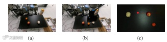 I-A:(a)-(b)橙子从其初始位置移动到苹果和纱线之间;(c)显示了视觉语言模型(VLM)识别出的满足 “中间” 条件的点。