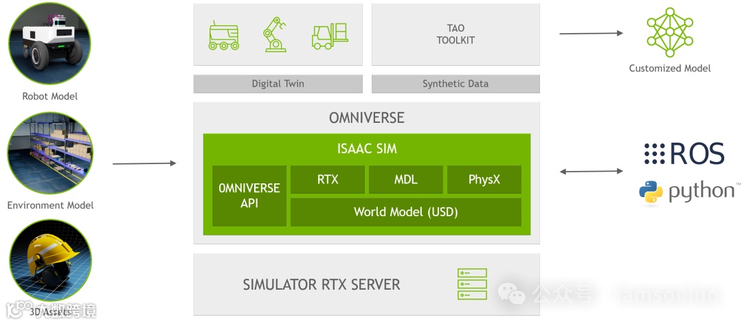 Isaac Sim 基于 NVIDIA Omniverse 平台构建,具备高度可扩展性,是一款集成了虚拟仿真、合成数据生成、以及物理准确环境模拟的工具。它提供了逼真的、物理属性准确的虚拟环境,使开发人员能够构建、测试和管理基于 AI 的机器人系统。