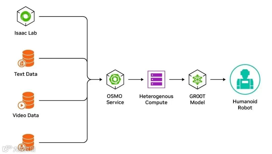 高效的并行处理能力:OSMO 可以在 NVIDIA DGX 和 NVIDIA OVX 服务器上并行运行多个模型,支持大规模的训练任务和仿真环境中的实时强化学习。这对于 GR00T 这样的多模态生成式 AI 模型至关重要,因为这些模型需要海量的数据和计算资源来不断迭代优化。