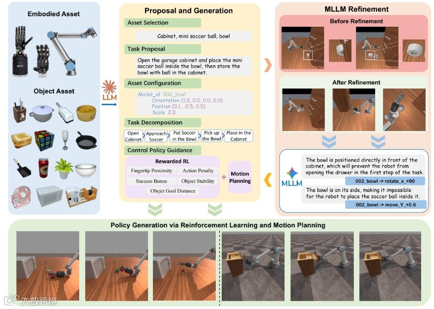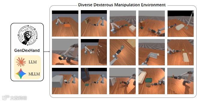 GenDexHand 任务生成流程概述。该过程包括四个阶段:环境提议、环境创建、多模态大语言模型(MLLM)优化和轨迹生成。首先向生成器提供具身资产和对象资产,以生成环境提议。然后,模拟器渲染所提议场景的多视图图像,并使用多模态大语言模型对其进行优化。最后,将优化后的环境与提议相结合,生成最终的灵巧手轨迹。