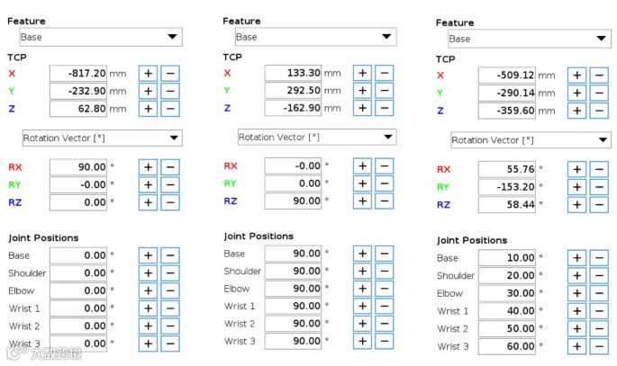 (UR机器人仿真器中的三种位形,用于验证POE运动学模型。MATLAB正运动学计算结果与仿真器一致)