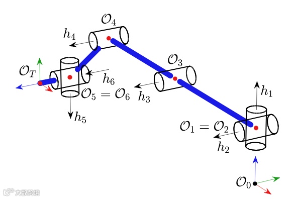 对于6自由度机器人,其运动学参数包括关节轴向量 H =[h1h2h3h4h5h6]和连杆位移向量 P=[p01p12p23p34p45p56p6T]。