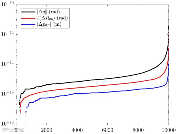 生成10000组随机关节角度,通过正运动学计算末端执行器位姿;然后计算原始关节角度向量与最接近的逆运动学解之间的差异,并测量末端执行器位姿在姿态和位置上的误差。