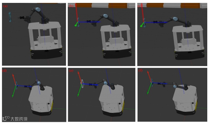 其中图 8(a)展示了检测到的物体边界框,图 8(b)展示了估计的物体位姿。这些视觉结果证明了该算法能够准确地定位和确定场景中目标的朝向,为后续的操作和规划任务提供了必要的输入。图 9(a)-(f)展示了机械臂响应书本位姿变化的运动截图。这些帧捕捉了机械臂调整其配置以接近目标物体时的自适应运动规划和执行过程。安装在固定移动平台上的机械臂根据视觉系统提供的更新位姿估计,动态调整其关节和末端执行器的位置。每个帧中可见的彩色坐标轴表示书本的估计位姿,突显了系统在接近过程中跟踪和对齐物体的能力。这一视觉证据强调了集成感知和规划框架在实现精确、响应迅速的物体交互方面的有效性。