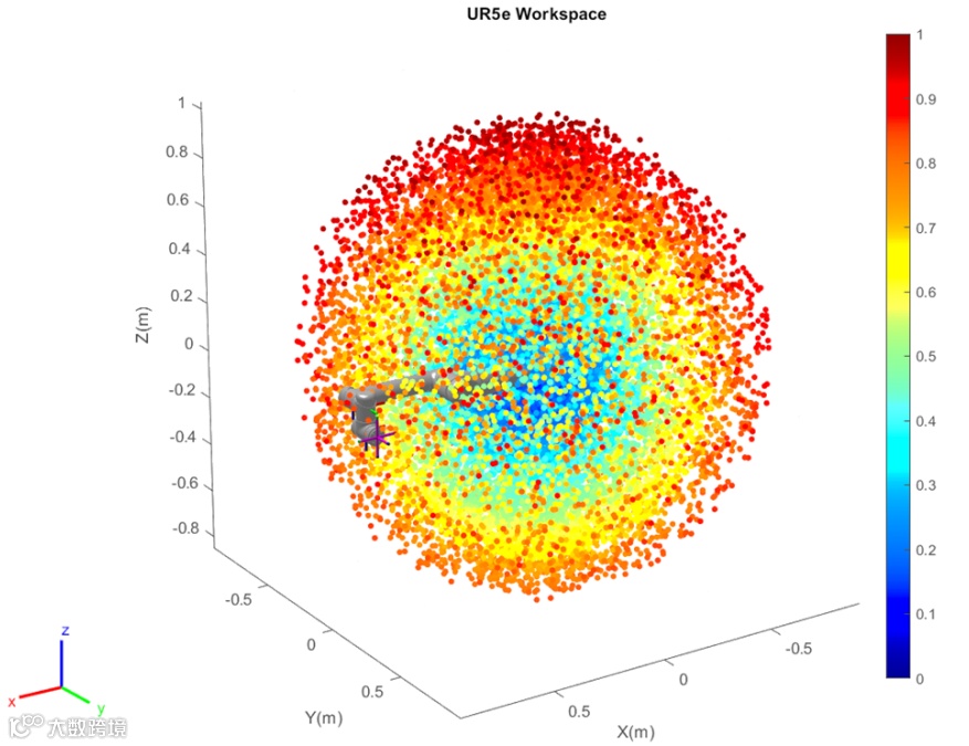 图 6 UR5e 机械臂的可达工作空间。3D 图展示了末端执行器位置的分布,颜色表示归一化的可达性值,突出显示了机械臂的有效操作体积。