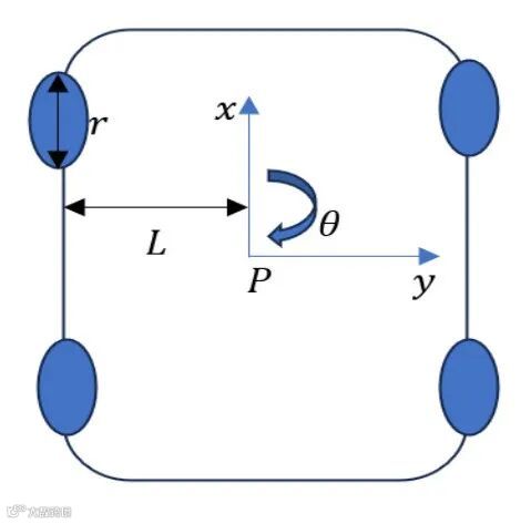 如图 4 所示的全向移动机器人配备了 4 个全向轮,与传统轮式机器人相比,具有更强的机动性,能够在任何方向上瞬时平移和旋转。为了准确建模其运动学,我们基于机器人力学原理定义了控制其运动的方程,考虑了车轮速度、力和扭矩。运动学模型描述了车轮速度与平台线速度 / 角速度之间的关系。每个车轮的半径为 r,距离机器人几何中心(标记为点 P)的距离为 L。这种对称配置使机器人能够实现完全的平面移动,能够独立控制平移和旋转。机器人位姿 P 定义如公式(1)所示: