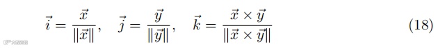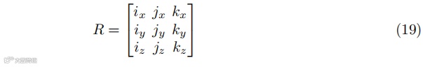 正交基(i、j、k)定义了物体在空间中的朝向。旋转矩阵 R 由方向向量构成: