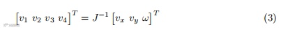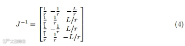 其中vx、vy为线速度,ω为角速度。车轮速度v1、v2、v3、v4与平台速度之间的关系如公式(3)所示: