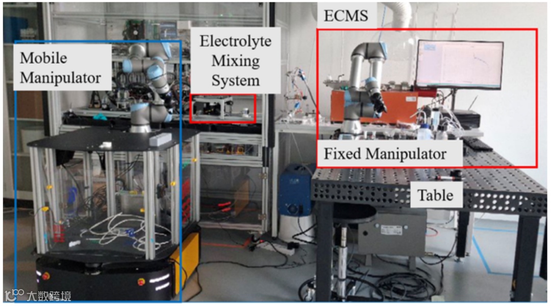 本研究采用结构化方法设计、实现和评估集成在自动驾驶化学实验室中的移动机械臂机器人。开发过程始于设计一种移动机器人系统,该系统能够在动态实验室环境中自主导航和执行拾取 - 放置操作,如图 2 所示。实验环境包括移动机械臂、固定底座机械臂、电解质混合系统和电化学质谱仪(ECMS)单元。移动机械臂系统基于 Clearpath Robotics 的 Ridgeback 全向平台构建,配备了 Universal Robots UR5e 协作机械臂和 Robotiq Hand-E 自适应夹爪,如图 3 所示。Ridgeback 底座具有全向运动能力和高有效载荷容量,能够在杂乱的实验室空间中进行精确灵活的移动。安装在平台上的 UR5e 机械臂具有 6 个自由度(DOF)、高定位精度和集成的力 - 扭矩传感功能,适用于精细操作任务。
