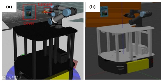 所提出的目标识别和位姿估计算法在机器人操作系统(ROS)环境中实现,集成了 OpenCV,运行在 Ubuntu 20.04 平台上,采用 3.0 GHz Intel Core i7-7400 CPU 和 16GB 系统内存。我们利用 RViz 和 Gazebo 开发了一个仿真环境,其中包含一个移动机械臂和一本带纹理封面的书,如图 7 所示。图 7(a)-(b)展示了 RViz 和 Gazebo 环境。