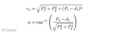 通过比较相关变换轴的方向向量,可以类似地计算θ5和θ6。剩余的关节角θ2、θ3和θ4通过平面 3-RRR 机构解确定。计算出θ1后,我们将期望的末端执行器位置转换到关节 2 的坐标系中。设rs表示从关节 2 到手腕中心的距离。该值可以通过应用几何关系确定,如下所示: