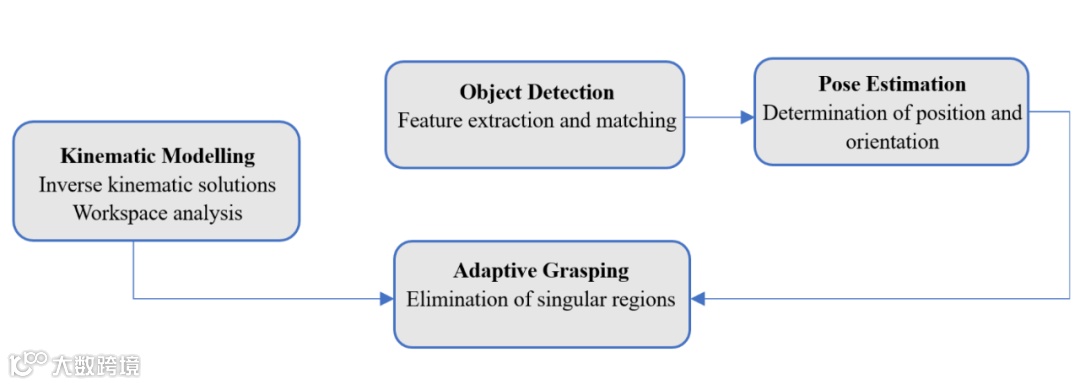 本研究中执行的不同任务流程如图 1 所示。机器人操作过程始于运动学建模,包括求解逆运动学和进行工作空间分析,以确定机器人末端执行器的可行配置。这一基础阶段确保机械臂能够到达并与操作范围内的物体进行交互。之后,通过特征提取和匹配技术执行目标检测,使系统能够识别和定位环境中的目标物体。检测到物体后,采用位姿估计确定物体的精确位置和朝向,为操作提供关键的空间信息。最后阶段涉及自适应抓取,机器人动态调整其抓取策略,消除奇异区域,确保与物体的稳定交互。这一连续框架有助于在复杂多变的环境中实现可靠且灵活的自主操作。