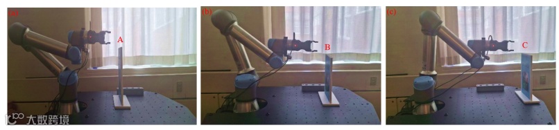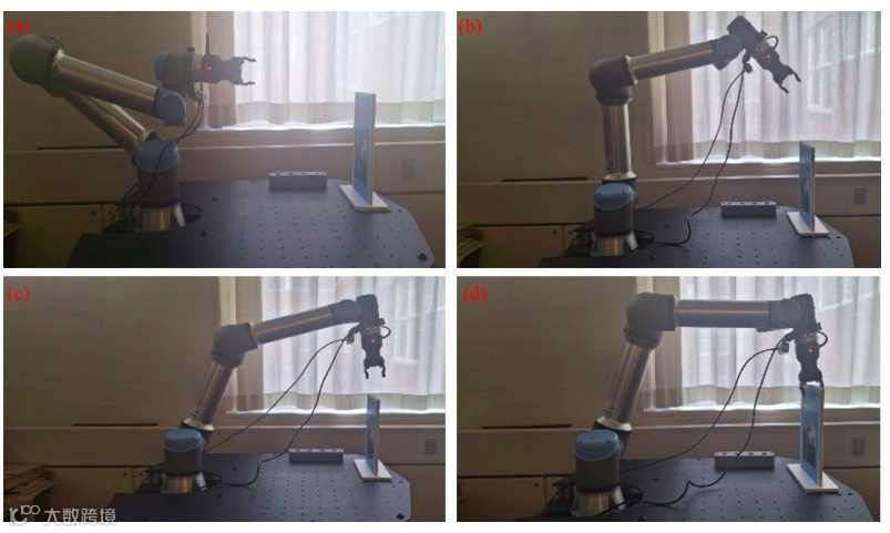 图 10 抓取任务期间操纵器的连续动作。(a)-(d)在视觉系统的位姿估计引导下,机械臂靠近带纹理的书封面、与之对齐并牢固抓取。