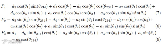利用基于 DH 参数的变换矩阵,末端执行器位置Pe(Px、Py、Pz)计算如下: