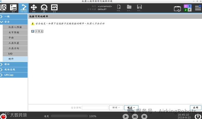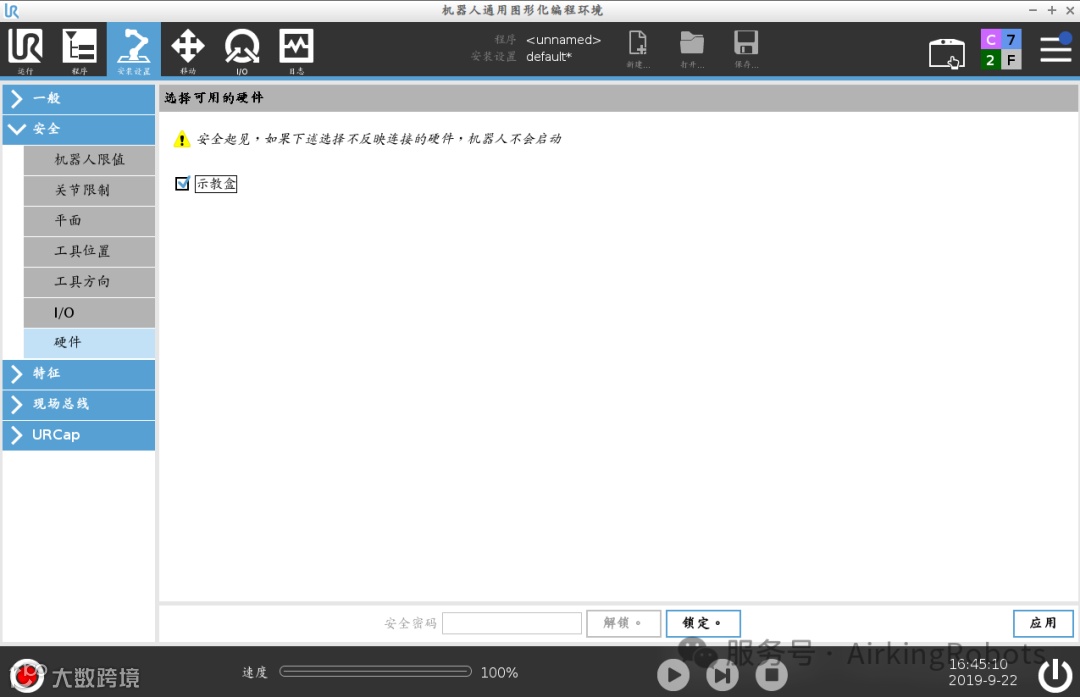 3、找到安装设置-安全-硬件选项卡,输入安全密码取消勾选示教器选项。