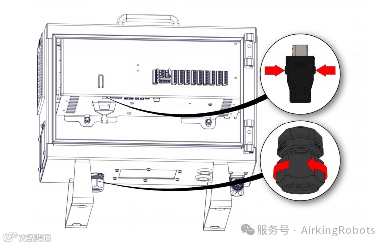 压入示教器两侧的卡子(如下图中红色箭头所示吊坠插头并拔下。完全打开/松开控制箱底部的塑料密封圈并拆下插头和电缆。轻轻拉出示教器电缆。
