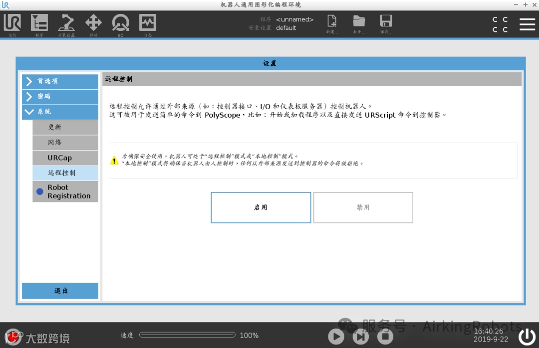 2、找到远程控制选项并点击启用,然后一个示教器的图标会显示在屏幕上