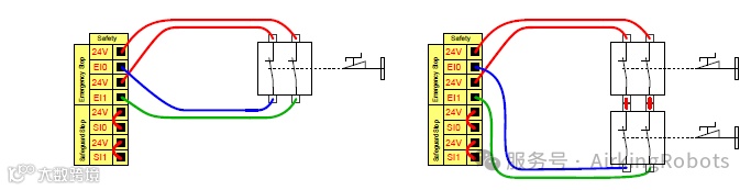 在用户手册中找到:“连接紧急停止按钮”(以下为两种连接方式)