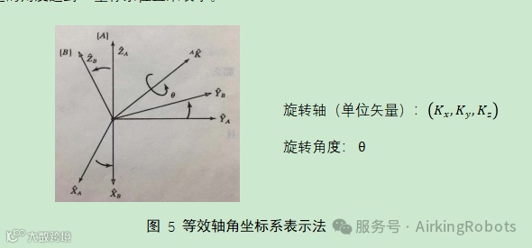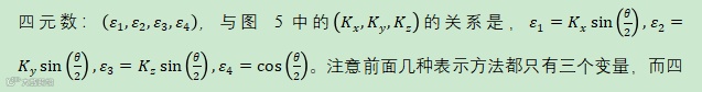 四元数和旋转矢量:四元数和旋转矢量的表示方法实际上属于一类表示法——等效轴角坐标系表示法。前三种表示方法都是采用按照一定的顺序旋转三个坐标轴,而等效轴角坐标系则是通过在空间定义一个轴,B坐标系可以通过使A参考坐标系绕着这根轴旋转一定的角度达到B坐标系位置来表示。
