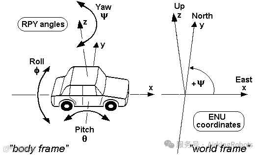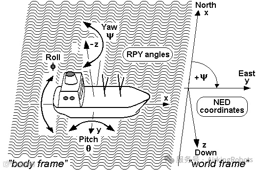 RPY(Roll-Pitch-Yaw)角,图 4:RPY主要在航空航天以及航海中用得比较多,前进方向定义为本地坐标系X轴,向上定义位Z轴,根据右手法则,Y轴朝向左侧。绕着X轴的旋转叫做翻滚Roll, Y轴旋转角俯仰角Pitch, Z轴旋转角偏航角Yaw。RPY相对的坐标系也是固定的参考系,如图 4中的世界坐标系,因此可以看到RPY定义跟X-Y-Z固定角坐标是一样的,只是因为历史习惯而采用不同的叫法。UR机器人中的RPY表示方法就是这种。
