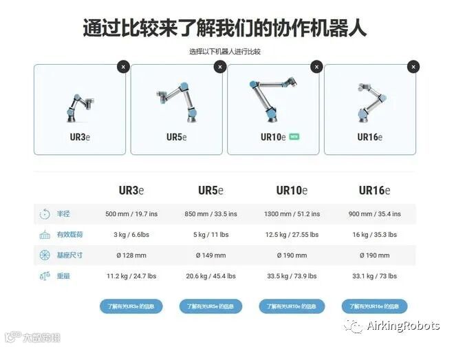 E系列机器人根据负载分UR3e,UR5e,UR10e,UR16e.