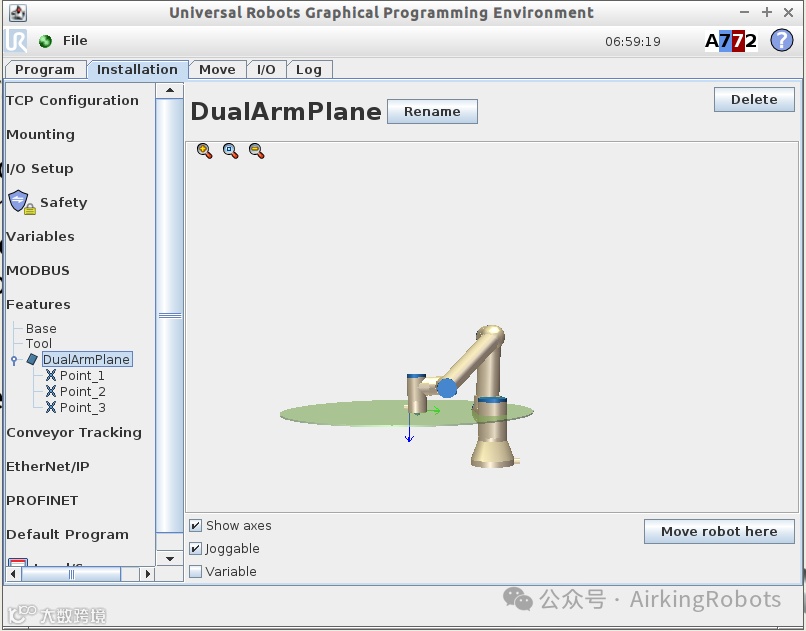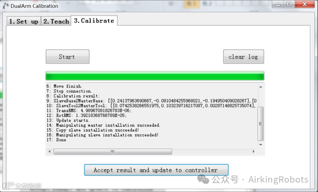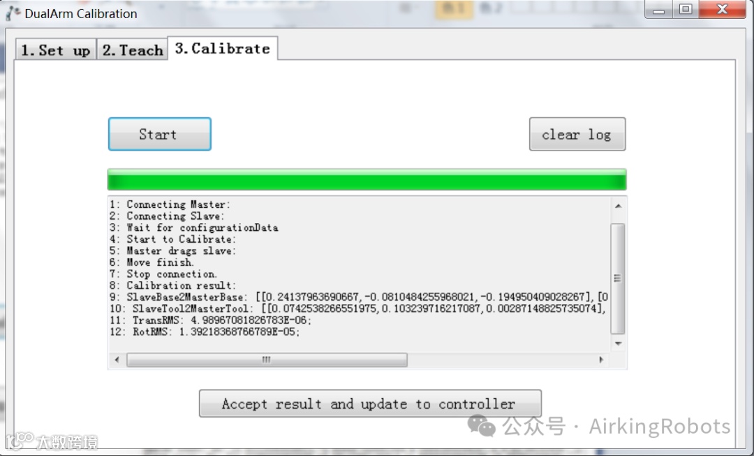 开始标定,点击Start即可启动标定,标定软件会根据机器人的型号自动选择由负载较大的机器人拖动较小的机器人,同型号机器人则是主机器人拖动从机器人。一个好的经验是将主动的机器人负载设置为3Kg,中心50mm,以保证机器人能够拖动另外一台机器人。标定结果会显示在Log框当中,当Trans和Rot残差较小时,即可接受结果,并且更新到控制器。此时从机器人中将新增加一个比步骤3中安装设置文件名多一个_DualArmCalibration的后缀的设置文件,加载即可看到DualArmPlane平面特征。