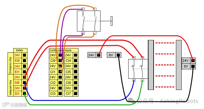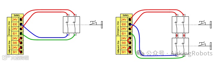 双臂作为一个整体,紧急停止(急停)信号需要共享,即触发任意一个急停信号另外一台机器人也需停止。若应用中只有双臂UR机器人则只需进行如下第1,3,4步,若还有外围的设备(如安全PLC)或者急停按钮需要连接,则进行如下第1 - 4步。