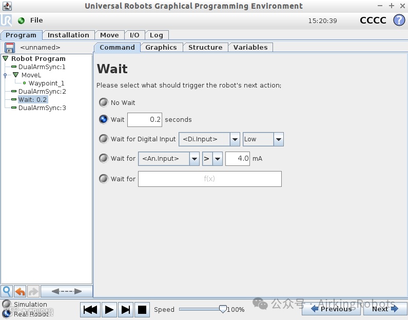 DualArmSync同步指令带有一个整型参数(1-32768),功能是让双臂程序运行至对应的同步指令时再开始往下运行。同步指令之前的move指令,Blend Radius必须为0。