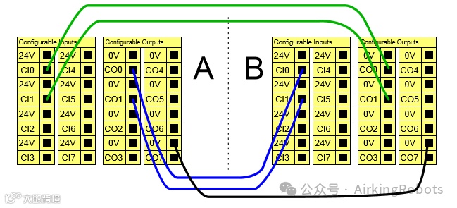 图 3 A位主UR机器人,B为外部设备(CI等效为外部设备急停输入信号,CO等效为外部设备急停输出信号