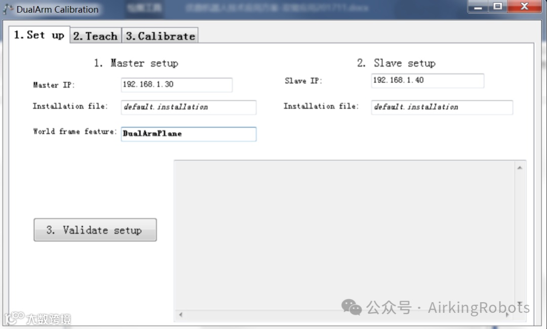 启动DualArmCalibration.exe程序,其中Master就是步骤2中定义共享坐标系的主机器人,其安装设置文件是包含有这个坐标系的文件;Slave的安装设置文件则是从机器人标定结束后以此为基础添加DualArm_Plane平面特征的文件;设置完成之后,点击Validate setup按钮,如果显示成功,那么即可进入第二个选项页Teach。